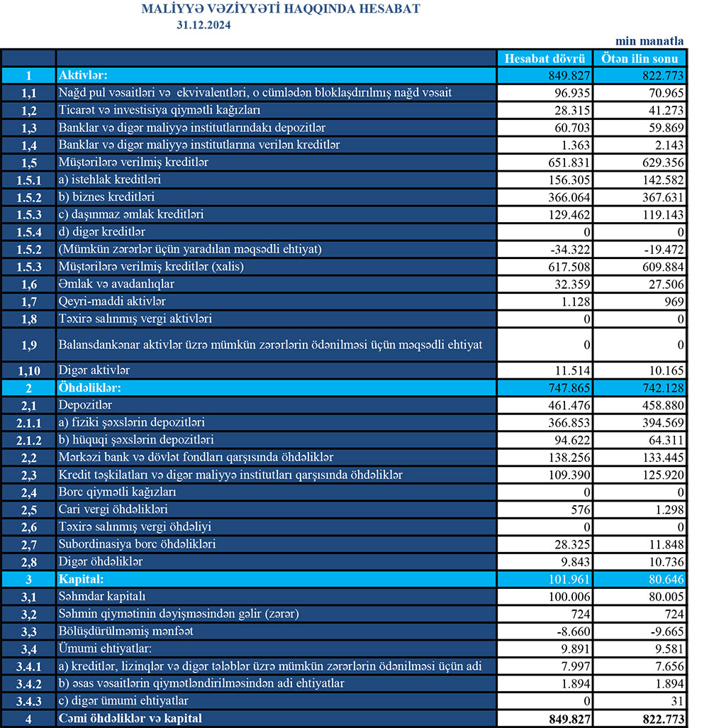 2024-cü ildə "Turanbank"ın cəmi kredit portfeli (müştərilərə verilmiş cəmi kreditlər) 22 milyon 475 min manat və ya 3,6% artaraq 651 milyon 831 min manata çatıb.