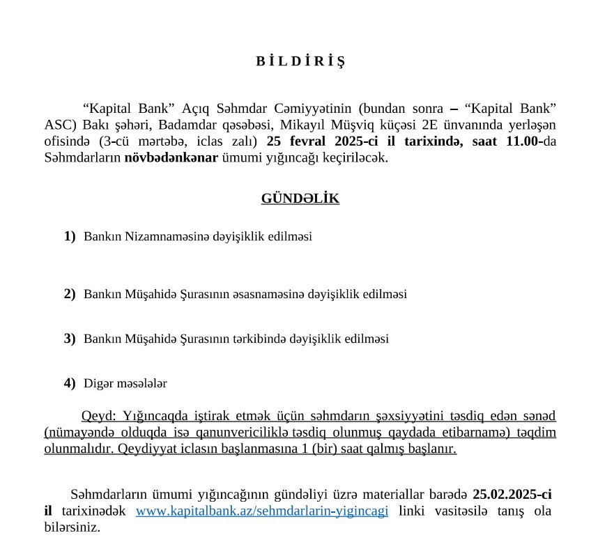 Bankın Müşahidə Şirasının tərkibində dəyişiklik edilməsi də gündəlikdəki məsələlərdən biridir.25 fevral 2025-ci il tarixndə "Kapital Bank" ASC səhmdarların növbədənkənar ümumi yığıncağı keçiriləcək.