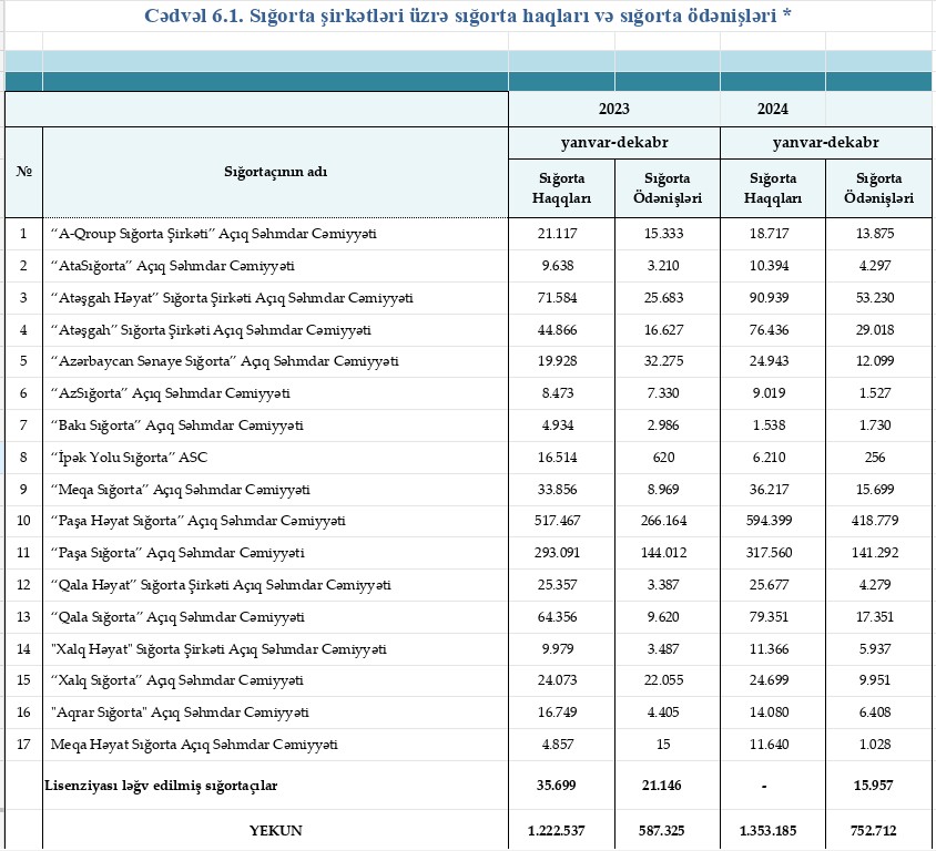 Azərbaycan Mərkəzi Bankı 2024-cü il üzrə sığorta icmalını açıqlatıb.