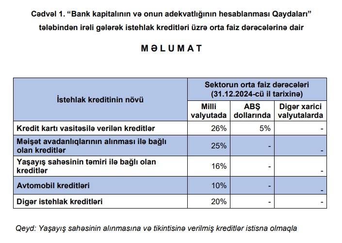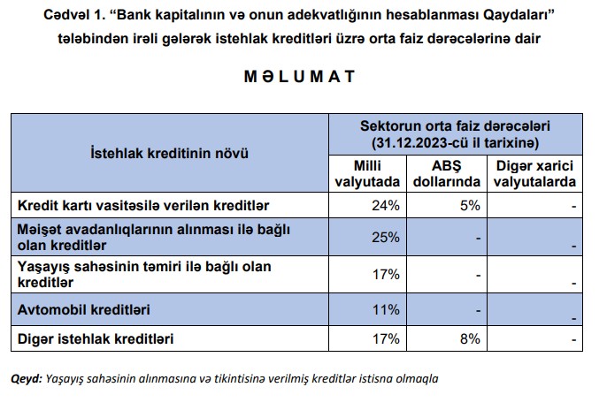 Azərbaycan Mərkəzi Bankı “Bank kapitalının və onun adekvatlığının hesablanması Qaydaları” tələbindən irəli gələrək istehlak kreditləri üzrə orta faiz dərəcələrinə dair məlumat yayıb.