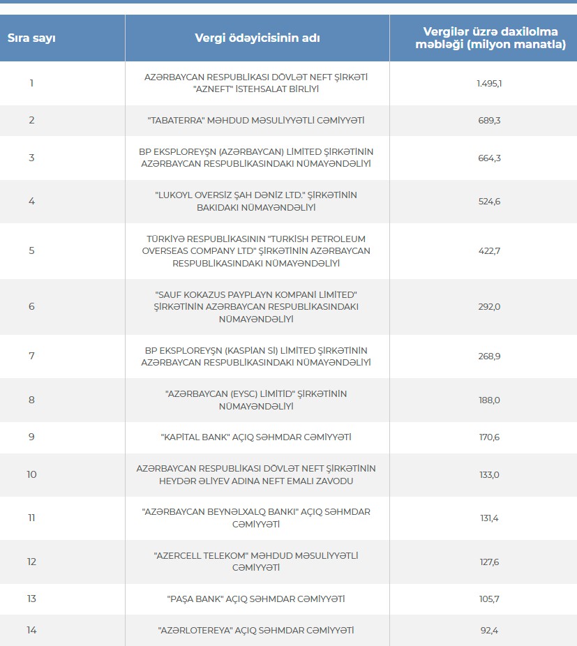 Marja.az Siyahıya istinadən xəbər verir ki, 1-cu yerdə dövlətə məxsus Azərbaycan Respublikası Dövlət Neft Şirkəti (SOCAR) "AZNEFT" İstehsalat Birliyidir. Qurum ötən il dövlət büdcəsinə 1 milyard 495,1 milyon manat vergi ödəyib.