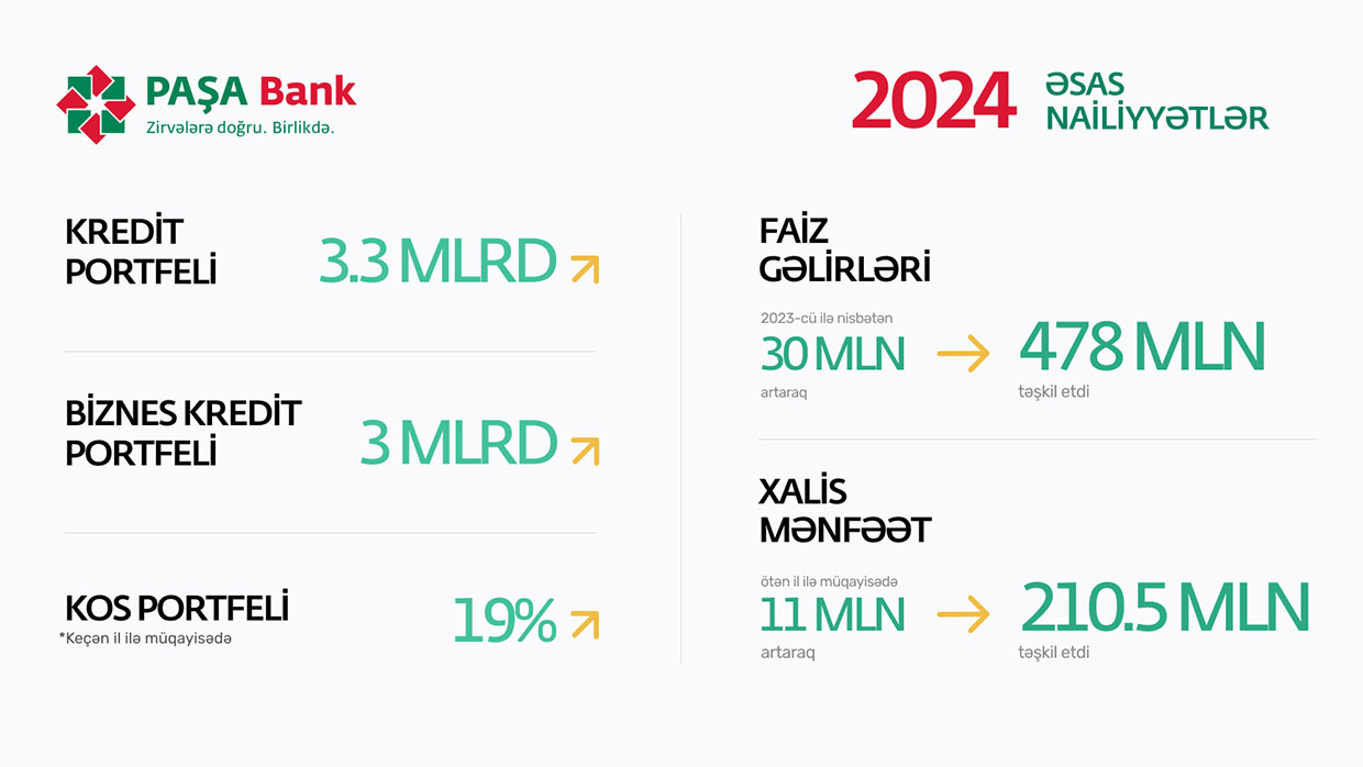 2024-cü ilə dair fəaliyyətindən danışarkən, C.Quliyev qeyd edib ki, real sektora xidmət göstərən “PAŞA Bank”ın göstəriciləri ümumi iqtisadiyyatımızın dayanıqlı inkişafı ilə birbaşa bağlıdır. Belə ki, 2024-cü ildə iqtisadi artım 4.1 % təşkil edib. 2023-cü ildə 123 milyard AZN olan ÜDM istehsalı 2024-cü ildə artaraq 126.3 milyard AZN-ə, o cümlədən qeyri-neft ÜDM isə 77.7 milyard AZN-dən 85.7 milyard AZN-ə yüksəlib. “Kredit portfelimiz isə 2023-cü il ilə müqayisədə 468 milyon AZN və ya 16.5% artaraq 3,3 milyard AZN-ə çatıb. Bu göstərici ölkənin qeyri-neft sektorundakı 6.2%-lik artımın (müqayisəli qiymətlərlə) üzərindədir. Bundan əlavə, biznes kredit portfelimiz, 3 milyard AZN-ə yüksəlib. Kiçik və orta sahibkarların (KOS) kredit portfelində isə öncəki illə müqayisədə 19% artım qeydə alınıb”, - deyə, Bank rəhbəri bildirib.