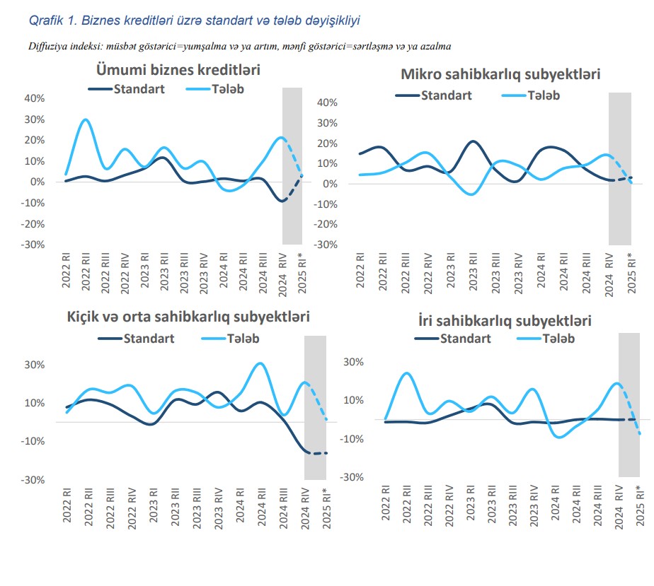 2024-cü ilin IV rübü üzrə sorğu nəticələrinə əsasən, mikro və iri sahibkarlıq subyektlərinə verilən kreditlər üzrə standartlarda dəyişiklik olmasa da, KOS (kiçik və orta sahibkarlıq) subyektləri üzrə kredit standartlarında sərtləşmə müşahidə edililib. Banklar növbəti rübdə ümumi biznes kreditləri, o cümlədən mikro və iri sahibkarlıq subyektləri üzrə kredit standartlarında dəyişiklik olmayacağı, KOS subyektləri üzrə isə standartlarda sərtləşmənin davam edəcəyi qənaətindədirlər. Banklar biznes kreditləri üzrə standartlarda dəyişikliklərin əsasən yuxarı riskli kreditlərə tətbiq olunan marja və kreditlərin maya dəyərinin artımı formasında olduğunu qeyd ediblər.