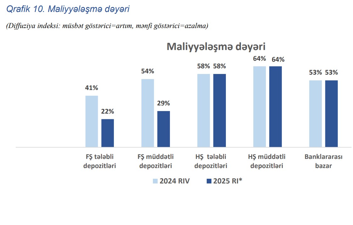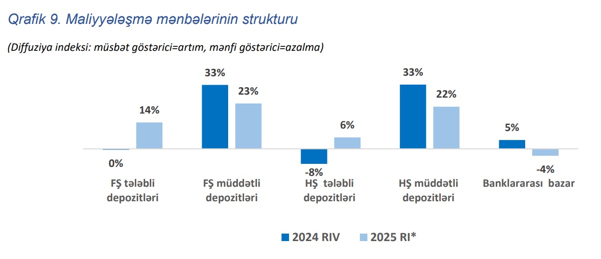 Kreditləşmə fəaliyyəti və maliyyələşmə mənbələrinə dair sorğunun nəticələrinə əsasən, 2024-cü ilin IV rübündə fiziki və hüquqi şəxslərin müddətli və tələbli depozitləri, həmçinin banklararası bazar üzrə maliyyələşmə dəyərində artım müşahidə edilib. Banklar növbəti rübdə də eyni tendensiyanın davam edəcəyini gözləyirlər.