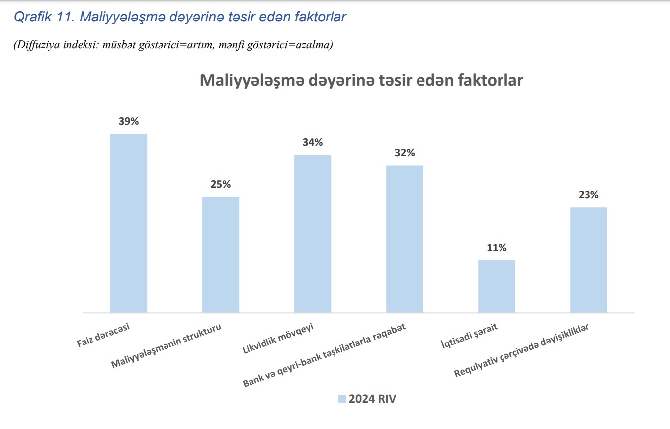 Sorğuda iştirak edən respondentlərin cavablarına əsasən, maliyyələşmə dəyərinin artmasına təsir edən əsas faktorlar faiz dərəcələri, bankın likvidlik mövqeyi, rəqabət və requlyativ çərçivədə baş vermiş dəyişikliklər olub.