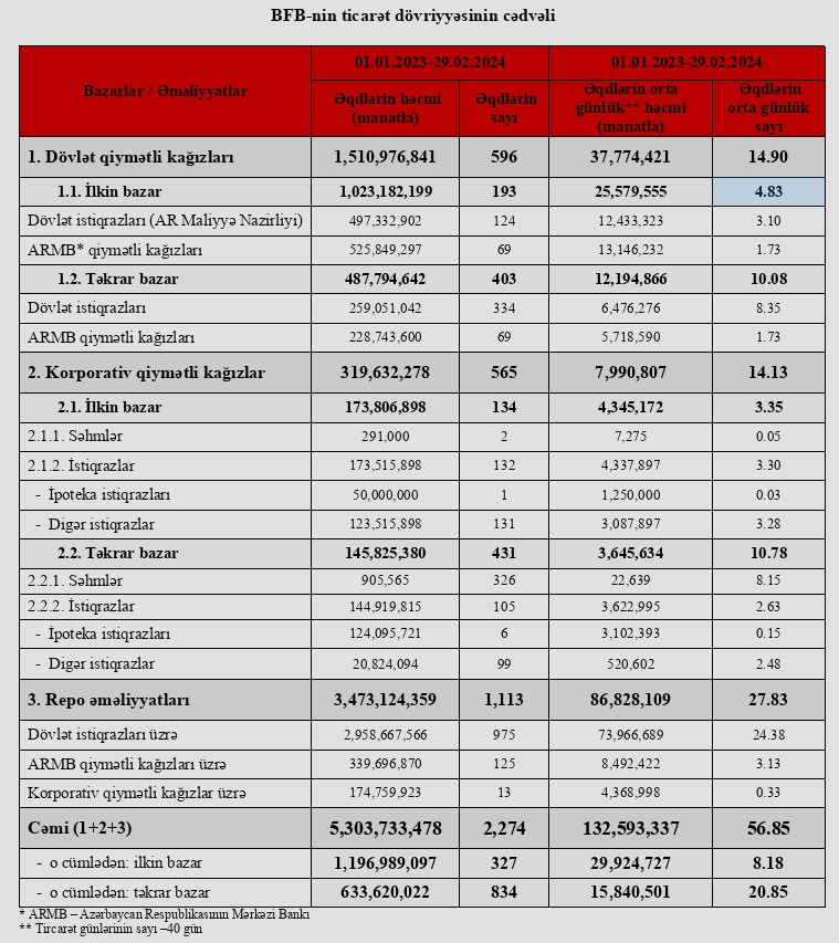 Xatırladaq ki, 2024-cü ilin yanvar-fevral ayları ərzində Bakı Fond Birjasında əqdlərin cəmi həcmi 5 milyard 303 miylon 733 min manat təşkil etmişdi. Beləliklə, Birjada əqdlərin cəmi həcmi cari ilin ilk 2 ayında ötən ilin eyni dövrü ilə müqayisədə 2,6 dəfə artıb. Artım əsasən repo əməliyyatları ilə bağlıdır.