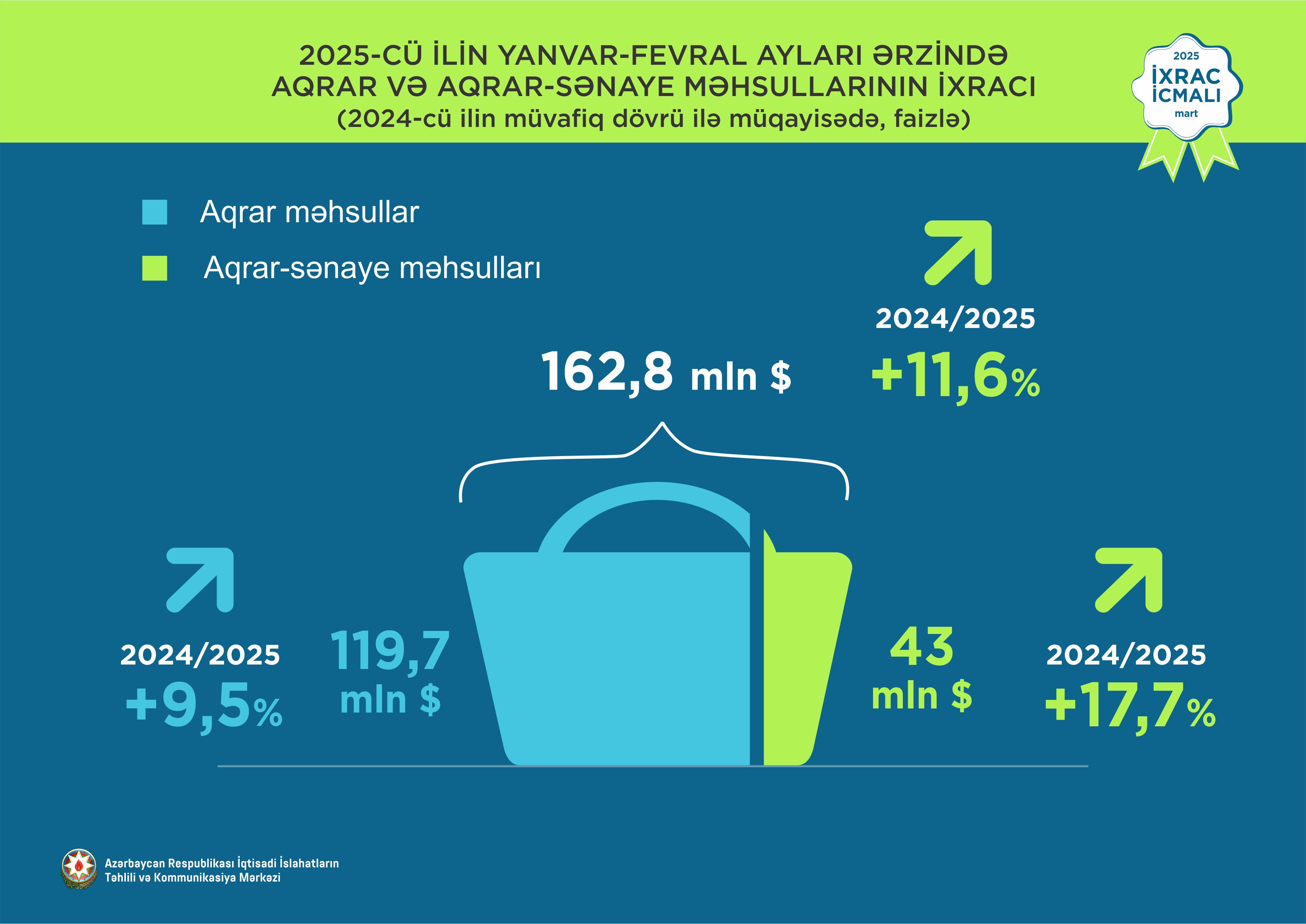 2025-ci ilin yanvar-fevral aylarında aqrar məhsulların ixracı 9,5% artaraq 119,7 milyon ABŞ dolları, aqrar-sənaye məhsullarının ixracı isə 17,7% artaraq 43 milyon ABŞ dollarına bərabər olub. Bütövlükdə, aqrar və aqrar-sənaye məhsullarının birgə ixracı 11,6% artaraq 162,8 milyon ABŞ dolları təşkil edib.