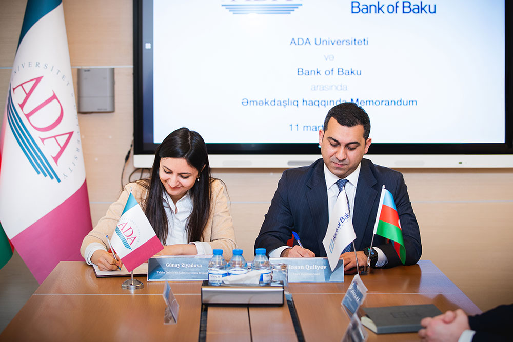 Əməkdaşlıq sazişini Bank of Baku-nun İdarə Heyətinin sədri Həsən Quliyev və ADA Universitetinin Tələbə Qəbulu və Xidmətləri üzrə Prorektoru Günay Ziyadova imzalayıblar.