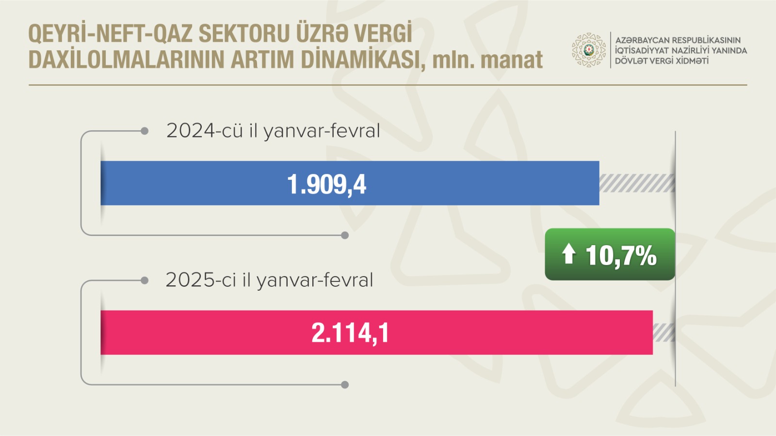 Qeyri-neft-qaz sektorundan daxilolmalar 2 milyard 114,1 milyon manatdan çox təşkil edib. Əvvəlki ilin müvafiq dövrü ilə müqayisədə bu sektordan vergi daxilolmaları 204,7 milyon manata yaxın və ya 10,7 faiz artıb.