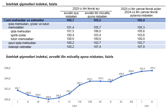 2025-ci ilin fevral ayında istehlak qiymətləri indeksi əvvəlki aya nisbətən 0,7 faiz, yanvar-fevral aylarında isə əvvəlki ilin müvafiq dövrünə nisbətən 5,4 faiz yüksəlib.