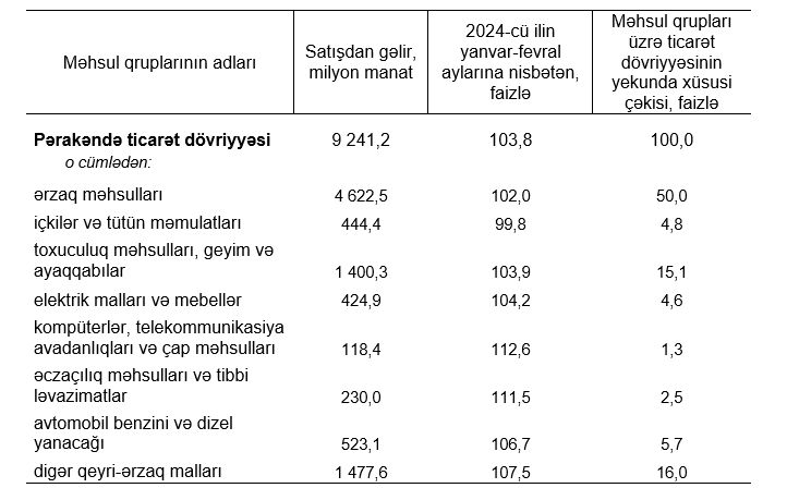 2024-cü ilin yanvar-fevral ayları ilə müqayisədə pərakəndə ticarət dövriyyəsi real ifadədə 3,8 faiz, o cümlədən ərzaq məhsulları, içkilər və tütün məmulatları üzrə 1,8 faiz, qeyri-ərzaq malları üzrə 6,2 faiz artmışdır.