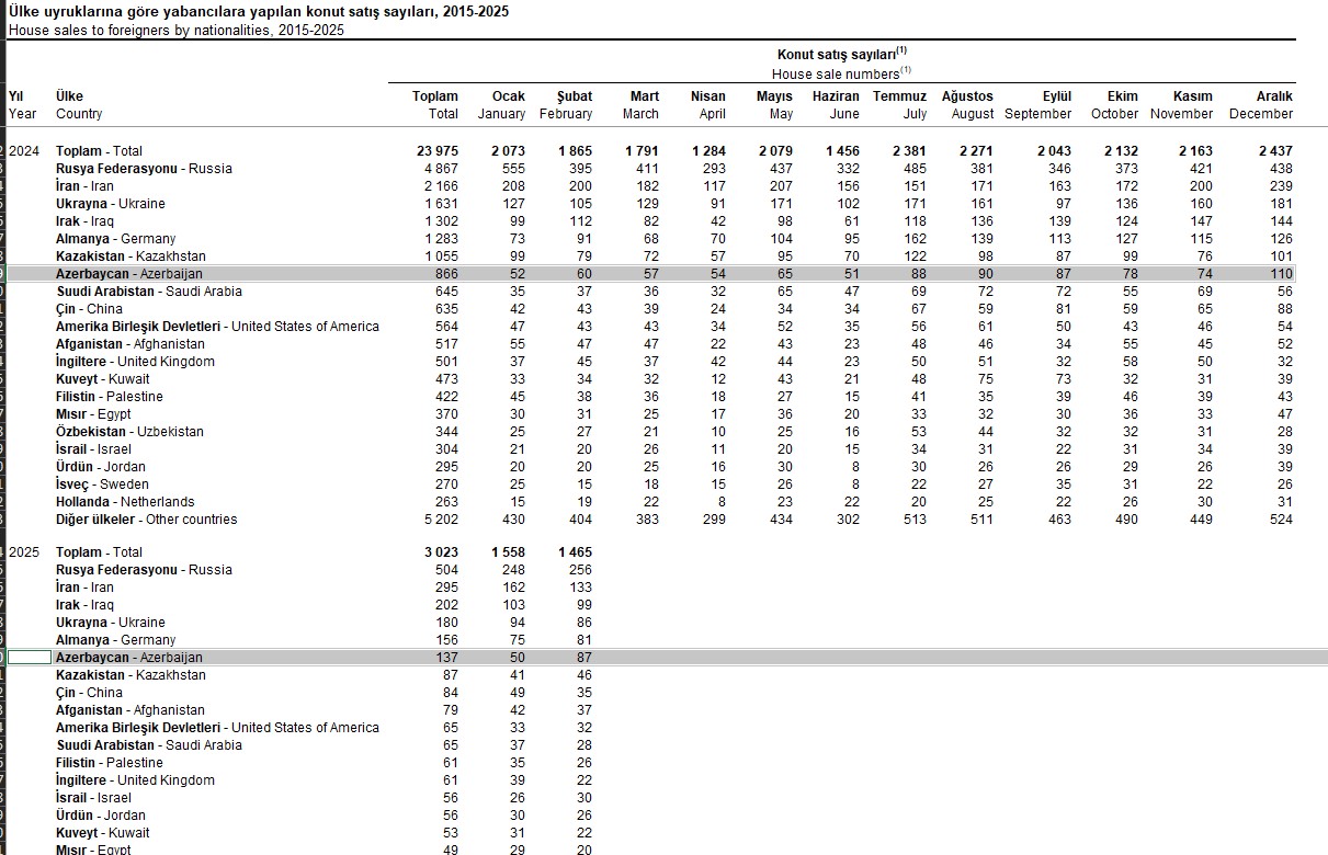 2025-ci ilin yanvar-fevral ayları ərzində (ilk 2 ayda) Azərbaycan vətəndaşları Türkiyədə 137 ev alıblar.