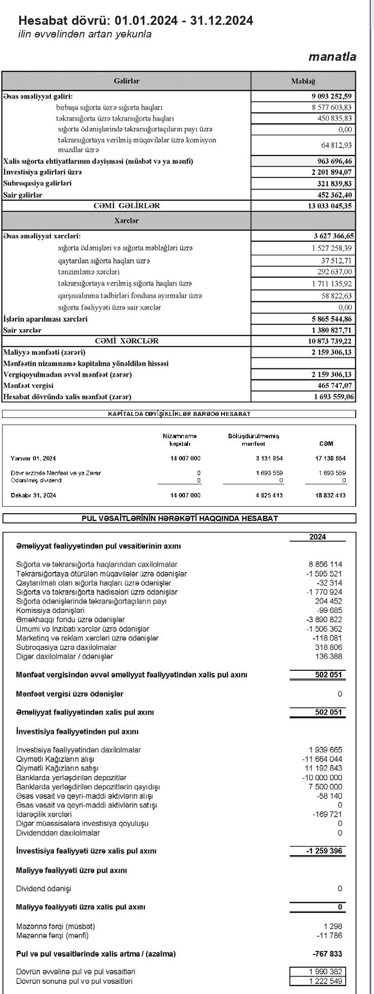 Marja xəbər verir ki, 2024-cü ildə "AzSığorta"nın cəmi əməliyyat gəlirləri 13 milyon 33 min manat, cəmi əməliyyat xərcləri 10 milyon 874 min manat təşkil edib. Müqayisə üçün qeyd edək ki, 2023-cü ildə Şirkətin cəmi əməliyyat gəlirləri 20 milyon 342 min manat, cəmi əməliyyat xərcləri 18 milyon 364 min manat təşkil etmişdi. Ötən il sığorta ödənişlərinin və təkrarsığortaya verilmiş sığorta haqları üzrə xərcilərin kəskin azalması şirkətin cəmi əməliyyat xərclərinin azalmasına səbəb olub.
