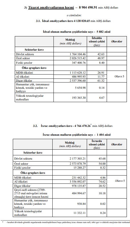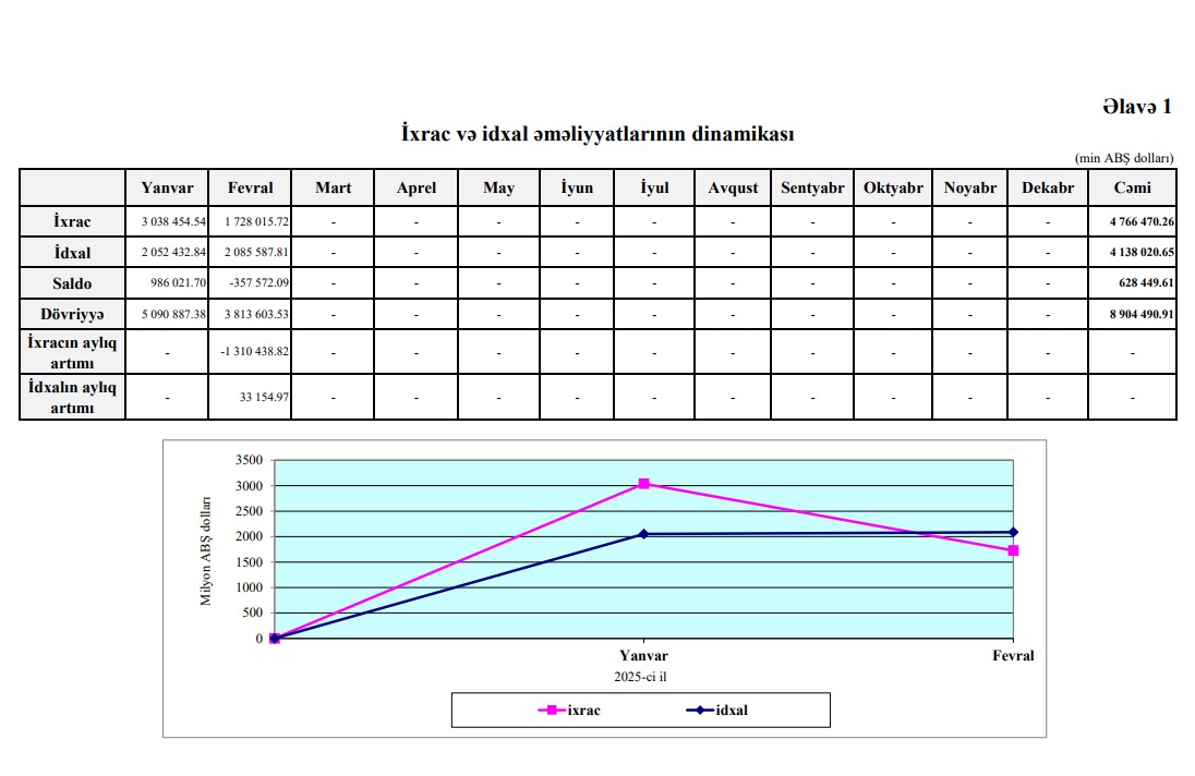 O cümlədən, il 2 ayda ixrac əməliyyatlarının dəyəri 4 milyard 766 milyon 470 min ABŞ dolları, idxal əməliyyatlarının dəyəri isə 4 milyard 138 milyon 21 min ABŞ dolları təşkil edib. Nəticədə saldo müsbət 628 milyon 450 min ABŞ dolları təşkil edib.
