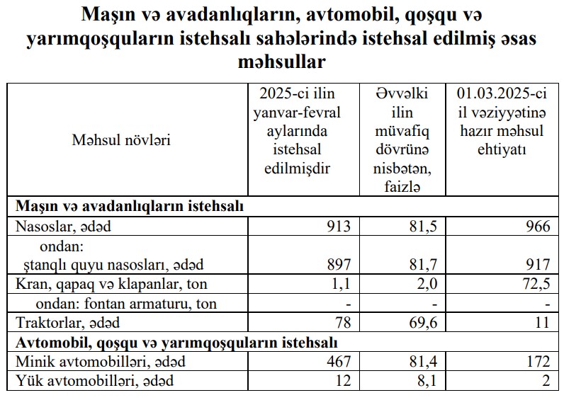 2025-сi ilin yanvar-fevral aylarında Azərbaycanda 467 ədəd və əvvəlki ilin müvafiq dövrü ilə müqayisədə 107 ədəd az minik avtomobili istehsal olunmuşdur (yığılmışdır).