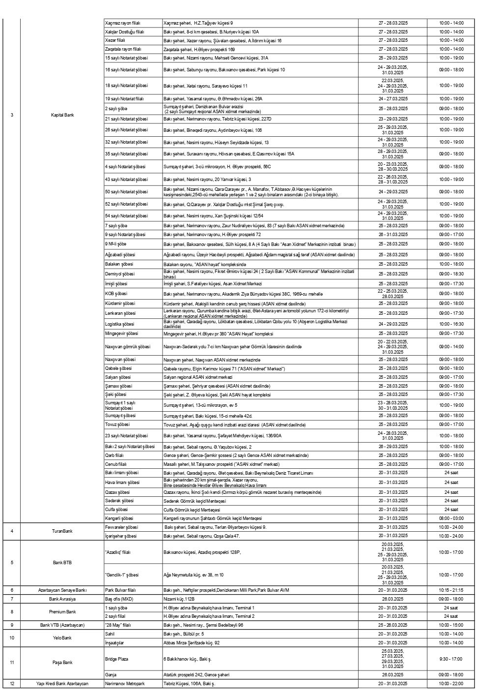 Bayram günlərində 17 bankın 212 satış nöqtəsi müştərilərə xidmət göstərəcək.20 – 31 mart 2025–ci tarixləri olan qeyri-iş günlərində bankların və “Azərpoçt” MMC-nin bəzi filial və şöbələri, habelə valyuta mübadilə məntəqələri fəaliyyət göstərəcəklər.