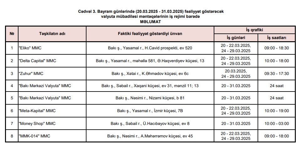 Qeyd edilib ki, bayram günlərində ölkəmizdə səfərdə olan turistlərin və ölkə vətəndaşlarının valyuta mübadiləsi xidmətlərinə davamlı çıxış imkanlarının təmin edilməsi məqsədilə ümumilikdə 17 bankın 212 satış nöqtəsi (o cümlədən, 4 bank üzrə 9 satış nöqtəsi 24 saat rejimində olmaqla), “Azərpoçt” MMC-nin 30 poçt filialı və şöbəsi, valyuta mübadiləsinə lisenziya almış 8 valyuta mübadiləsi məntəqəsi (o cümlədən, 2-i 24 saat rejimində olmaqla) müştərilərə xidmət göstərəcək.