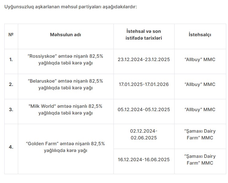 Qeyd edək ki, aşkarlanan uyğunsuzluqlar qida məhsulunun təhlükəsizlik göstəriciləri ilə bağlı olmasa da, istehsalçı tərəfindən qanunvericiliyə zidd şəkildə istehlakçıların aldadılması və hüquqlarının pozulması hesab olunur. Belə ki, kərə yağı məhsullarının üzərində təbii inək südündən alınmış, pasterizə edilmiş qaymaqdan istifadə edilməsi bəyan edilsə də, yoxlama zamanı məhsulun faktiki tərkibinə bitki yağının qatılması halı aşkar edilib.