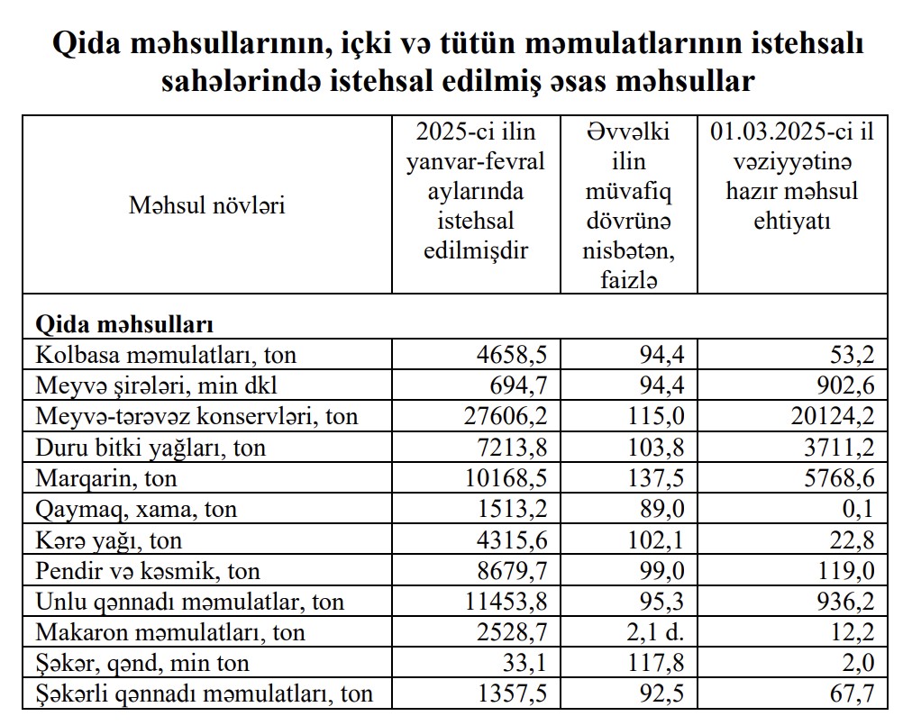 2025-сi ilin yanvar – fevral ayları ərzində, əvvəlki ilin müvafiq dövrü ilə müqayisədə qida məhsullarının istehsalında 10,7 faiz, içki istehsalında 5,4 faiz artım, tütün məmulatlarının istehsalında isə 25,4 faiz azalma müşahidə olunmuşdur.