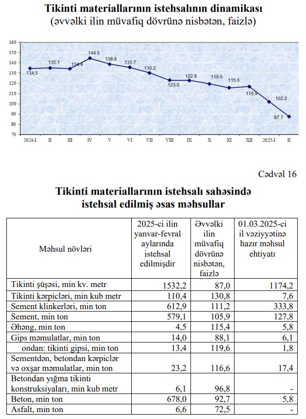 Dövr ərzində gips məmulatlarının istehsalı 11,9 faiz, tikinti şüşəsinin istehsalı 13,0 faiz, asfalt istehsalı isə 27,5 faiz azalmışdır.