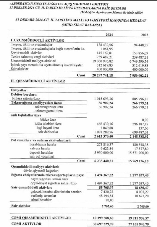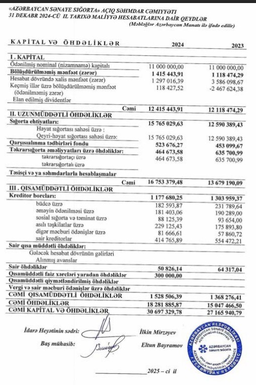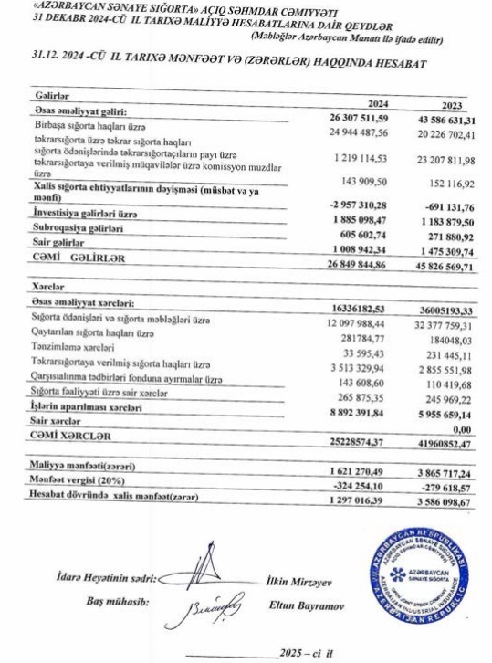"Azərbaycan Sənaye Sığorta" ASC 2024-cü ili 1 milyon 297 min manat xalis mənfəət ilə başa vurub. Şirkət 2023-cü ili 3 milyon 586 min manat xalis mənfəət ilə bağlamışdı. Beləliklə, "Azərbaycan Sənaye Sığorta"nın xalis mənfəəti 2024-cü ildə 2023-cü illə müqayisədə 2 milyon 289 min manat və ya 2,8 dəfə azalıb.