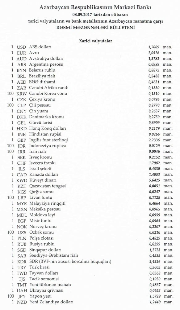 Sentyabrın 7-də rəsmi olaraq 1 dollar 1,7009 manata, 1 avro isə 2.0283 manata bərabər idi.