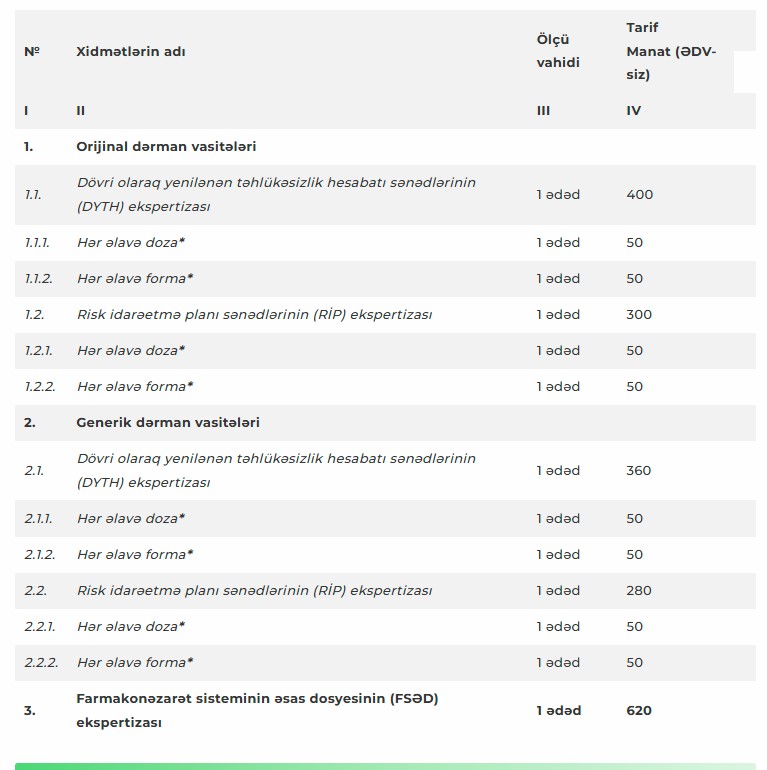 Dərman vasitəsi dövlət qeydiyyatına alındıqdan sonra təqdim edilən farmakonəzarət sənədləri ilə bağlı ekspertiza xidmətlərinin tarifləri aşağıdakı kimidir: