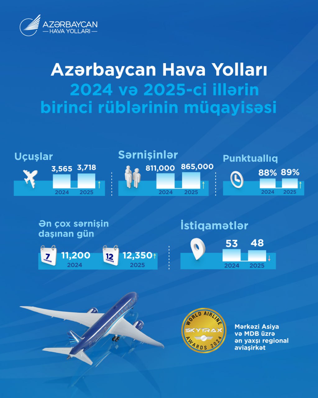 Bu ilin ilk üç ayında 89% uçuşların vaxtında yerinə yetirilməsi göstəricisi ilə 48 istiqamət üzrə 3 718 reys yerinə yetirilib. 2024-cü ilin birinci rübü ilə müqayisədə punktuallıq göstəricisi üzrə 1%, reyslərin sayı üzrə isə 4% artım müşahidə olunub. Qeyd edək ki, 2025-ci ilin mart ayında punktuallıq göstəricisi 93%-ə çatmışdır.