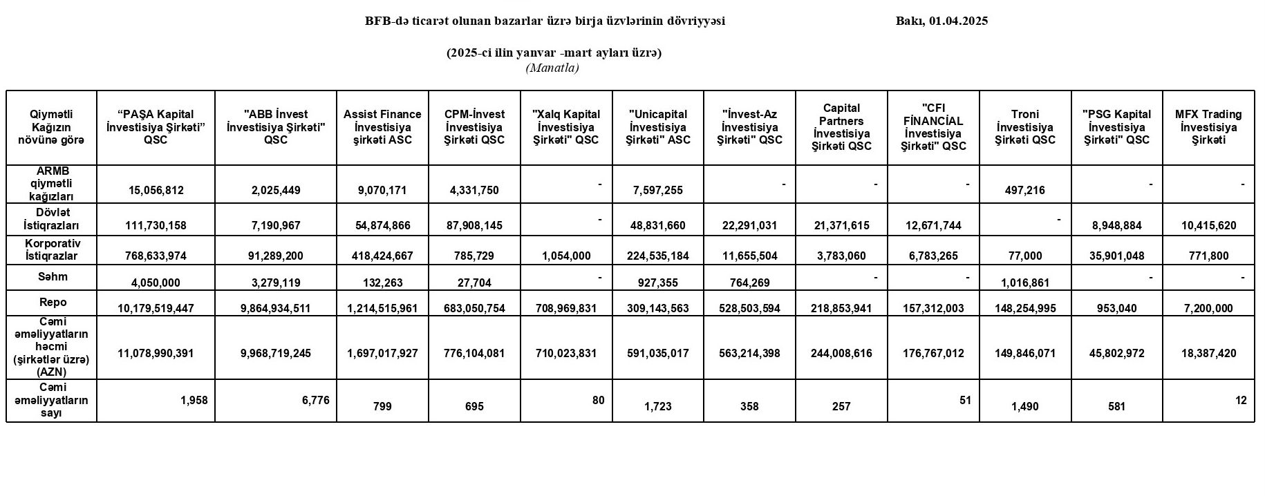 2025-ci ilin yanvar -mart ayları üzrə Bakı Fond Birjasında (BFB) ticarət olunan bazarlar üzrə birja üzvlərinin (investisiya şirkətlərinin) dövriyyələri açıqlanıb.