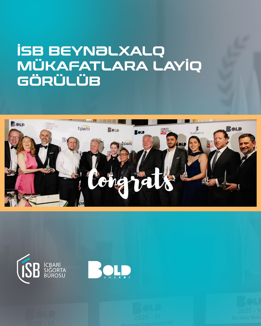 İcbari Sığorta Bürosu “Hüquqi Şəxslərin İttifaqı” (İSB) nüfuzlu “The BOLD Awards” beynəlxalq müsabiqəsinin qalibi olub. İSB-nin innovasiya, texnologiya və rəqəmsal sənaye üzrə əldə etdiyi nailiyyətlər yüksək qiymətləndirilərək mükafatlara layiq görülüb.