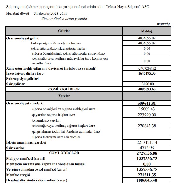 "Meqa Həyat Sığorta" ASC 2024-cü ili 1 milyon 524 min manat xalis mənfəət ilə başa vurub. Şirkət 2023-cü ili 1 milyon 86 min manat xalis mənfəət ilə bağlamışdı. Beləliklə, "Meqa Həyat Sığorta"nın xalis mənfəəti 2024-cü ildə 2023-cü illə müqayisədə 438 min manat və ya 40,3% artıb.