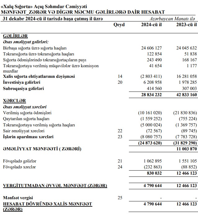 "Xalq Sığorta" ASC 2024-cü ili 4 milyon 791 min manat xalis mənfəət ilə bağlayıb. Şirkət 2023-cü ili 12 milyon 466 min manat xalis mənfəət ilə bağlamışdı. Beləliklə, "Xalq Sığorta"nın xalis mənfəəti 2024-cü ildə 2023-cü illə müqayisədə 2,6 dəfə və ya 7 milyon 675 min manat azalıb.