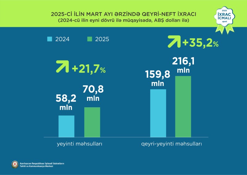 İcmala əsasən, 2025-ci ilin yanvar-mart aylarında Azərbaycanın qeyri-neft sektoru üzrə ixracı 2024-cü ilin müvafiq dövrü ilə müqayisədə 14,7% artaraq 771,9 milyon ABŞ dolları təşkil edib. Cari ilin ilk üç ayında yeyinti məhsullarının ixracı 15,1% artaraq 224,7 milyon ABŞ dollarına bərabər olub.