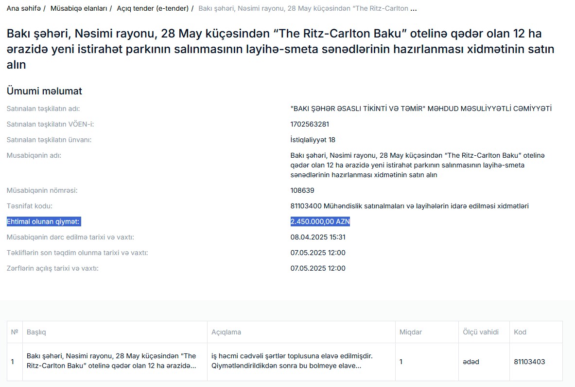 Marja.az xəbər verir ki, tender ilə Bakı şəhəri, Nəsimi rayonu, 28 May küçəsindən “The Ritz-Carlton Baku” otelinə qədər olan 12 ha ərazidə yeni istirahət parkının salınmasının layihə-smeta sənədlərinin hazırlanması xidməti satın alınır.