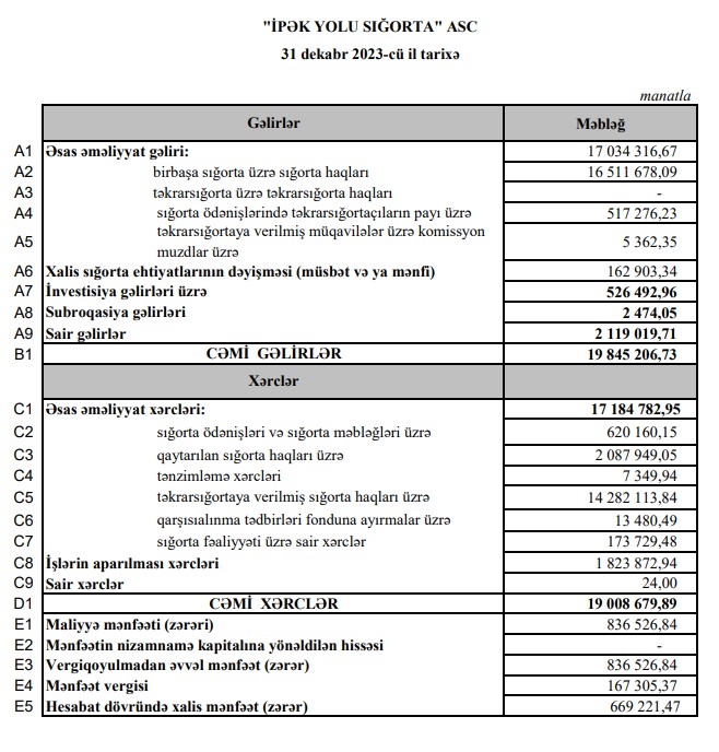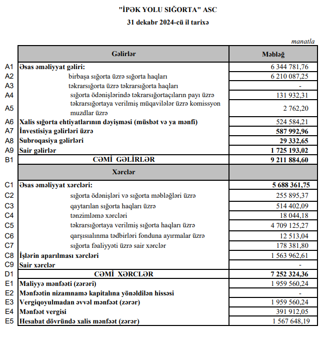 Marja.az Şirkətin maliyyə göstəricilərinə istinadən xəbər verir ki, "İpək Yolu Sığorta"nın 2023-cü ildə cəmi gəlirləri 19 milyon 845 min manat ikən, 2024-cü ildə 9 milyon 212 min manat təşkil edib (10 milyon 633 min manat və ya 53,5% azalıb). O cümlədən, Şirkətin hesabladığı sığorta haqları 10 milyon 302 min manat və ya 62,4% azalaraq 6 milyon 210 min manata düşüb.