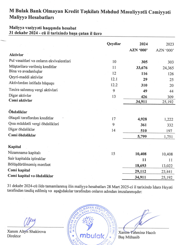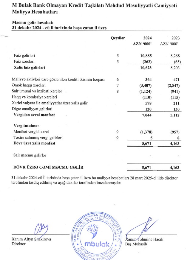 "M Bulak Bank Olmayan Kredit Təşkilatı" MMC 2024-cü ili 5 milyon 671 min manat xalis mənfəət ilə başa vurub. Kredit təşkilatı 2023-cü ili 4 milyon 163 min manat xalis mənfəət ilə bağlamışdı. Beləliklə, "M Bulak BOKT"ın xalis mənfəəti 2024-cü ildə 2023-cü illə müqayisədə 1 milyon 508 min manat və ya 36,2% artıb.