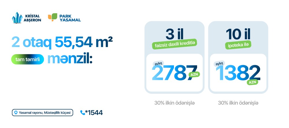 Bəli, bu artıq mümkündür! "Kristal Abşeron"un "Park Yasamal" yaşayış kompleksi sizə tam təmirli təhvil veriləcək mənzilləri faizsiz, komissiyasız, daxili kreditlə təqdim edərək, arzuladığınız mənzilə sahib olmaq şansını əlçatan edir.