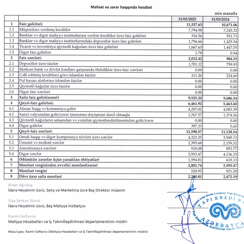 Türkiyə kapitallı "Yapı Kredi Bank Azərbaycan" QSC 2025-ci ilin 1-ci rübünü (yanvar-mart) 2 milyon 281 min manat xalis mənfəət ilə başa vurub. Bank ötən ilin eyni dövrünü 2 milyon 472 min manat xalis mənfəət ilə bağlamışdı. Xalis mənfəətin 191 min manat azalması mümkün zərərlər üzrə yaradılan ehtiyatlara daha böyük məbləğdə vəsait ayrılması ilə əlaqədardır. İlk rübdə "Yapı Kredi Bank Azərbaycan"ın gəlirləri, əməliyyat mənfəəti artıb.