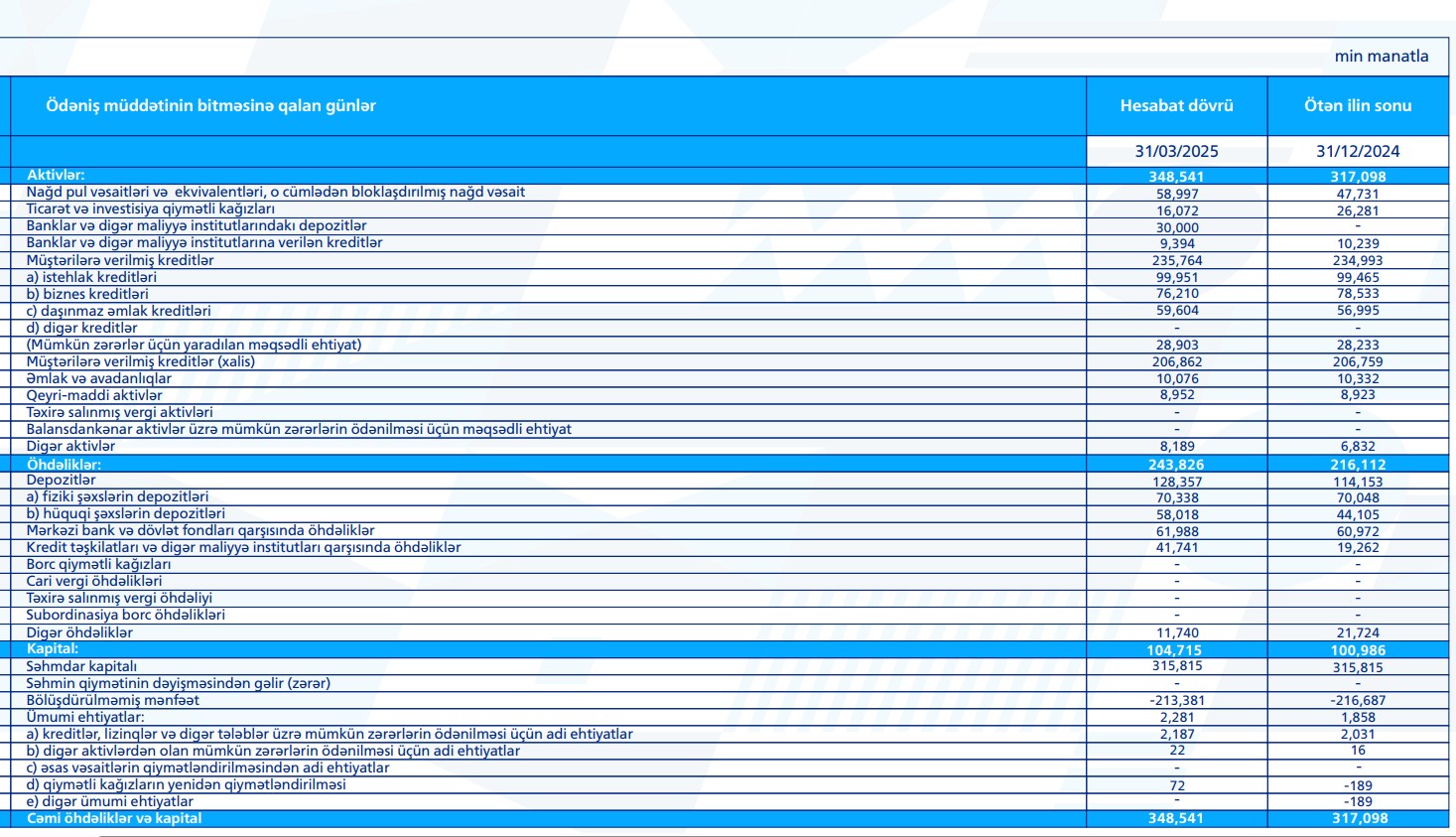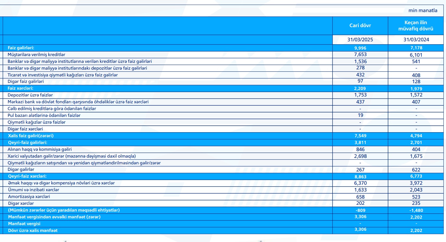 Bankın xalis faiz gəlirləri 2024-cü ilin birinci rübü ilə müqaisədə 2025-ci ilin birinci rübündə 42,5 faiz artaraq 7,5 milyon manat, qeyri-faiz gəlirləri isə 40 faiz artaraq 3 milyon 811 min manat təşkil edib.