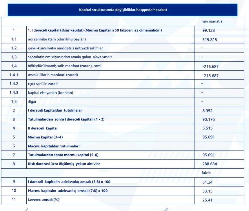 Bankın məcmu kapitalı 95 milyon 691 min manatı ötüb ki, bu da Mərkəzi Bankın normativ tələblərini 45 milyon 691 min manat (təxminən 2 dəfə) üstələyir.
