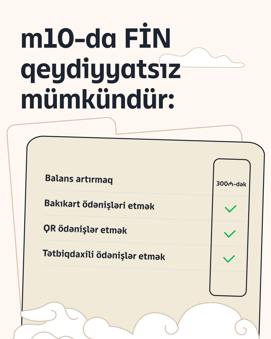 Bəli, FİN identifikasiyası olmadan da m10 tətbiqindən müəyyən limitlər daxilində istifadə etmək mümkündür: