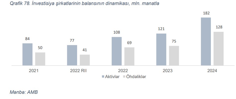 Hesabat ili ərzində investisiya şirkətlərinin balansı genişlənmişdir. 2023-cü ilin sonu ilə müqayisədə investisiya şirkətlərinin aktivləri 50% (61 mln. manat) artaraq 182 mln. manat, öhdəlikləri isə 71% (53 mln. manat) artaraq 128 mln. manata çatmışdır. İnvestisiya şirkətlərinin aktiv və öhdəliklərindəki artımı şərtləndirən əsas amil repo/əksrepo əməliyyatlarının həcminin artımı ilə bağlı olmuşdur.