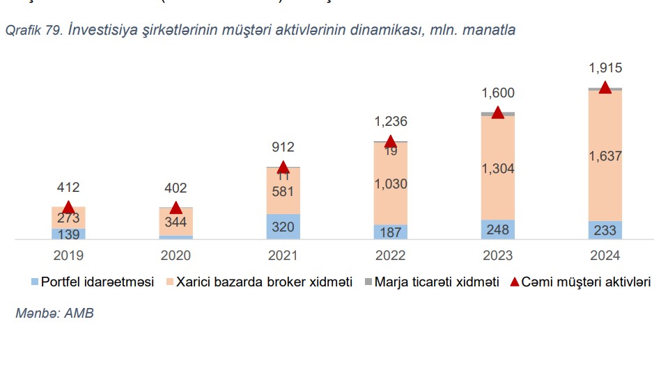 Qeyd edilib ki, dövr ərzində investisiya şirkətlərinin müştəri aktivləri genişlənmişdir. 2023-cü ilin sonu ilə müqayisədə investisiya şirkətlərinin müştəri aktivləri 20% (315 mln. manat) artaraq 1,915 mln. manata çatmışdır. Müştəri aktivlərində artımın əsas drayveri xarici bazarda broker xidmətləri olmuşdur. Belə ki, xarici bazarda broker xidmətləri üzrə müştəri aktivləri 26% (333 mln. manat) artmışdır.
