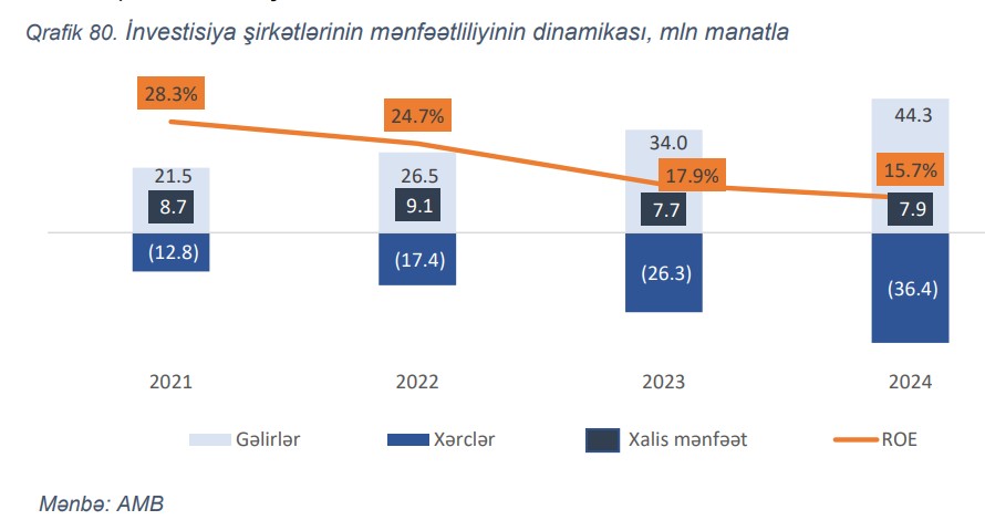 İnvestisiya şirkətlərinin xalis mənfəətində artım müşahidə edilmişdir. Belə ki, ötən ilin sonu ilə müqayisədə 2024-cü il ərzində investisiya şirkətlərinin xalis mənfəəti 2.7% (0.2 mln. manat) artaraq 7.9 mln. manat olmuşdur. İnvestisiya şirkətlərinin xalis mənfəətində artım müşahidə edilsə də, artan kapital fonunda ROE göstəricisi 2.2 f.b. azalaraq 15.7% olmuşdur.