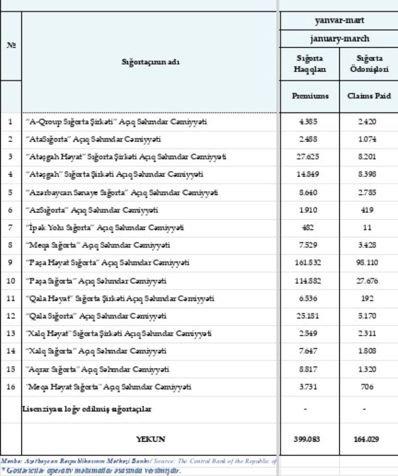 Müqayisə üçün qeyd edək ki, 2024-cü ilin yanvar-mart ayları ərzində Azərbaycandakı sığorta şirkətləri tərəfindən 373 milyon 140 min manat sığorta haqları hesablanmış, 153 milyon 327 min manat sığorta ödəniləri həyata keçirilmişdi.