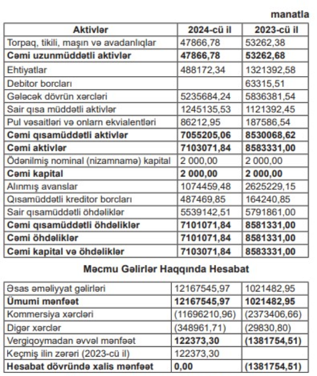 “DDLAR İnşaat” QSC 2024-cü ildə nə xalis mənfəət, nə də xalis zərər edib. Müqayisə üçün qeyd edək ki, Şirkət 2023-cü ili 1 milyon 382 min manat xalis zərər ilə bağlamışdı.