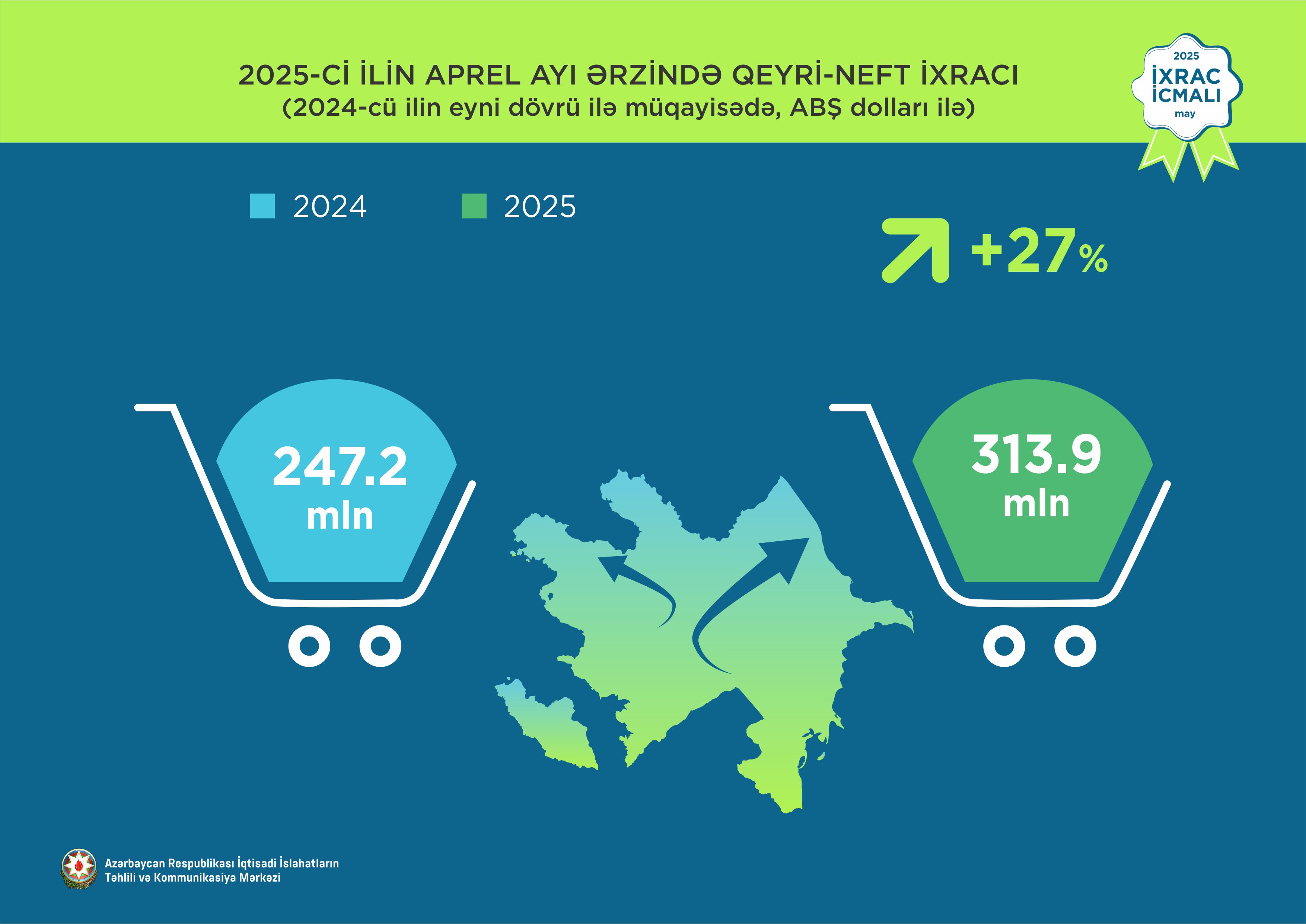 İcmala əsasən, 2025-ci ilin yanvar-aprel aylarında Azərbaycanın qeyri-neft sektoru üzrə ixracı 2024-cü ilin müvafiq dövrü ilə müqayisədə 18% artaraq 1,1 milyard ABŞ dolları təşkil edib. Bu dövrdə yeyinti məhsullarının ixracı 12,1% artaraq 300.1 milyon ABŞ dollarına bərabər olub.