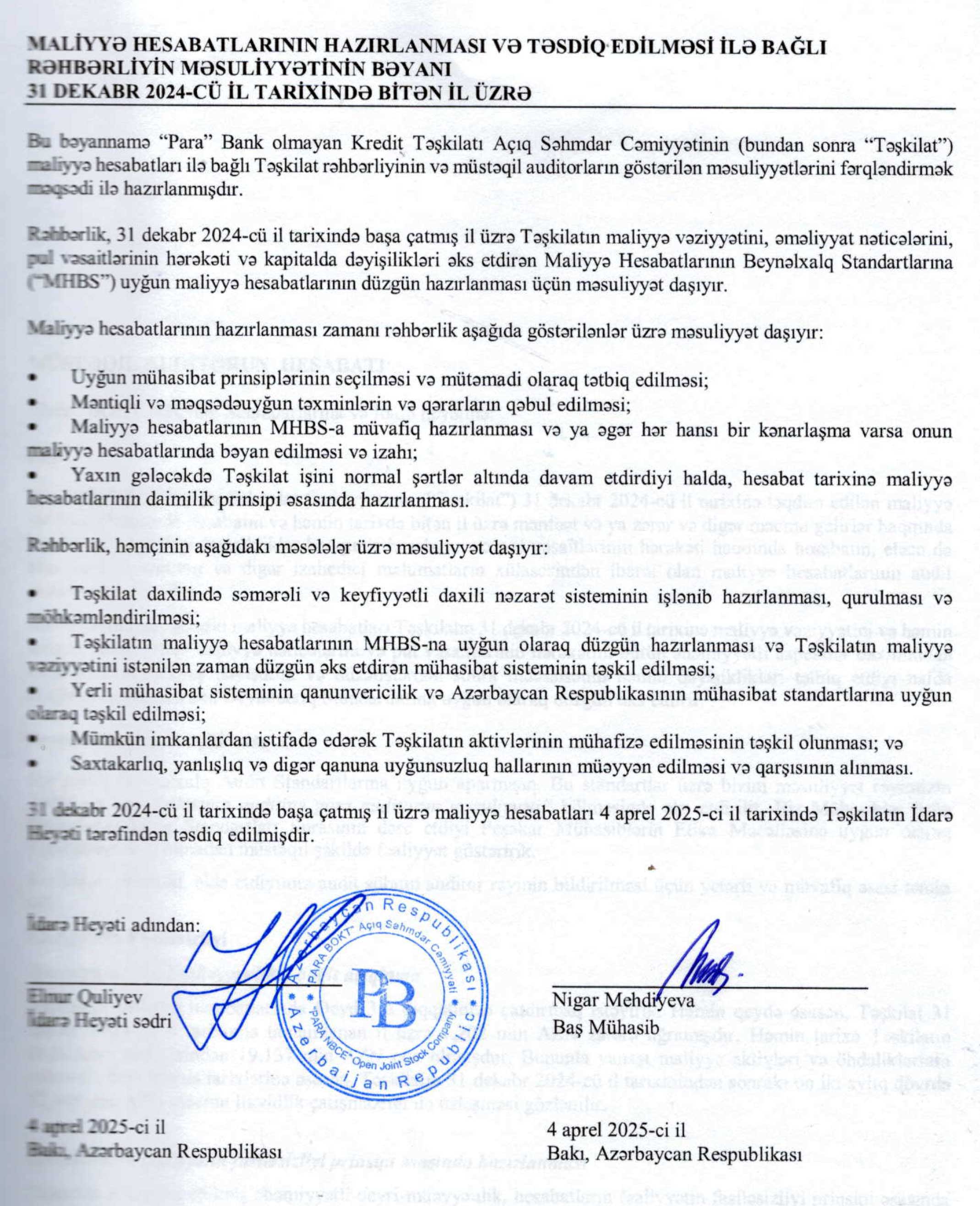 “Para BOKT” ASC 2024-cü il üzrə maliyyə göstəricilərini açıqlayıb.
