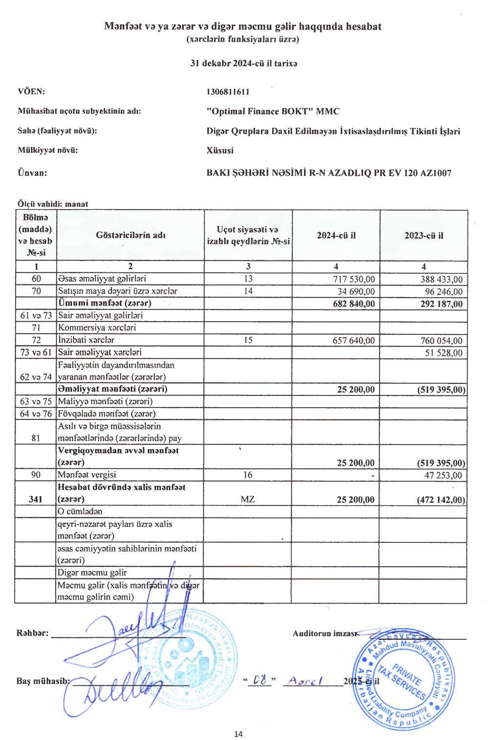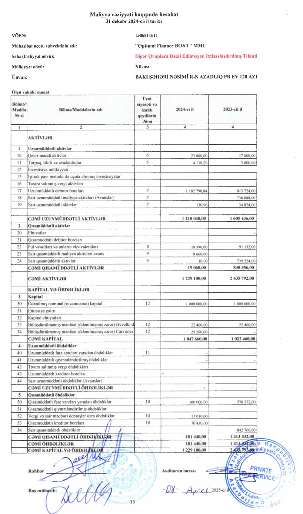 "Optimal Finance BOKT" MMC-nin 2024-cü il üzrə maliyyə hesabatları