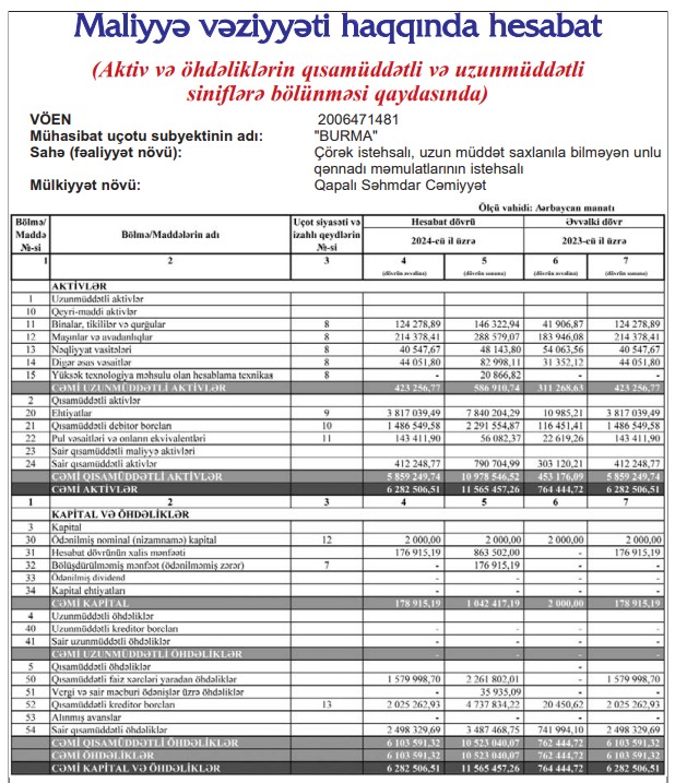 Çörək və qənnadı məmulatların istehsalı ilə məşğul olan "Burma" QSC 2024-cü ili 864 min manat xalis mənfəət ilə başa vurub. Şirkət 2023-cü ili 177 min manat xalis mənfəət ilə bağlamışdı. Beləliklə, "Burma" şirkətinin xalis mənfəəti 2024-cü ildə 2023-ü illə müqayisədə 4,9 dəfə artıb.